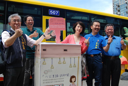 臺中市搭公車除了享受八公里免費之外,還可以欣賞詩文!市府文化局與交通局邀臺中市12家市公車業者協助,在全市185路線、1,000多輛公車上張貼詩作海報,圖文並茂,每兩週更替1次,幸福詩路讓搭公車不再單調。