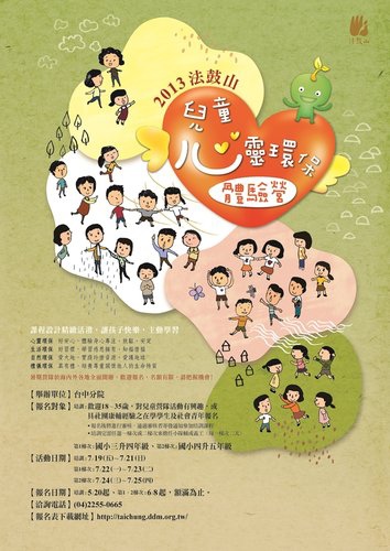 同時在營隊前7/197/21,也為青少年舉辦為期三天兩夜的隊輔培訓,藉由兒童營隊之執行,將佛法的智慧與慈悲,融入營隊團體生活與團康活動之中,成為全方位的小隊輔導員。歡迎1835歲的青年報名,為自己創造一個不同的2013暑假。2013.06.17