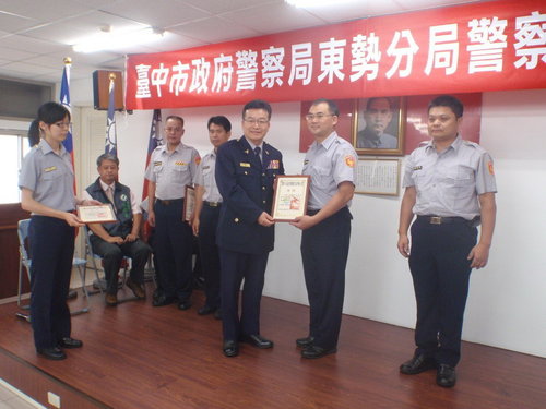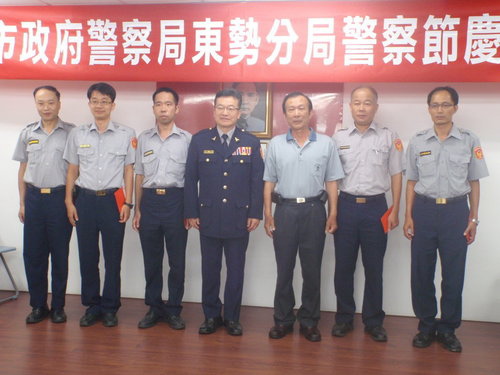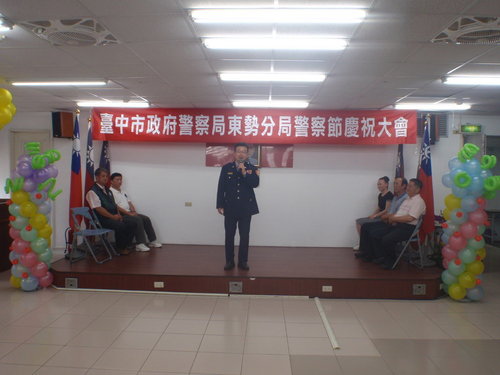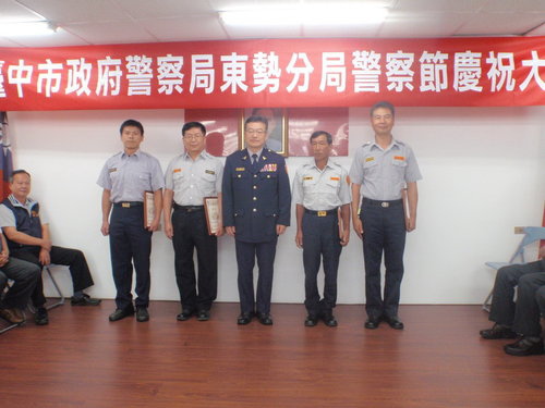 東勢分局為慰勉員警平日執勤之辛勞暨增進同仁情誼、凝聚團隊向心力,以提高工作士氣,於6月13日11時在分局大禮堂,舉辦「102年警察節慶祝大會」活動,會中表揚特殊績優同仁、協勤民力及優良員工計16人,並頒發員警破案暨勤業務評核績優獎勵金計271件;本次慶祝大會計約有100人參與,並邀請各級長官、貴賓及退休人員蒞臨,場面溫馨融洽。 活動由分局長蔡榮林主持,並邀請轄區議員、東勢警友辦事處林主任、分局義警、民防及志工等協勤民力幹部蒞臨與會。蔡分局長除恭賀獲獎員警、協勤民力優異殊榮外,並向在場所有同仁表達慰勉之意及祝賀「警察節」快樂,也希望藉此機會對各項工作表現優異同仁公開表揚,以激勵每位同仁都能秉持「標竿學習」及「捨我其誰」的精神,今後仍將持續積極投入刑案偵防、加強交通執法及提升為民服務品質。 慶祝大會表揚項目中,以遴選頒發「102年上半年各項勤業務最優楷模」計8名員警最受矚目,計有該分局行政組警務員王建華、警備隊警員邱華文2員「查緝正心正風工作12件」、偵查隊偵查佐林旻賢「查緝販毒集團案2件」、石岡所警員范志強「查緝通緝犯15名」、東勢交通分隊警員莊忠義「取締酒後駕車17件」、東勢所巡佐郭文達「取締非法外勞8件」、東勢所警員焦德培「協尋失蹤人口13人」及中坑所警員賴重漢「執行社會救助通報17件」,均屬各該項最優楷模,與會貴賓、同仁於該8名員警受頒表揚時,均大力鼓掌,豎起大姆指大聲叫好,為他們能當選「標竿學習楷模」喝采。 慶祝大會活動結束後並備有中、西式餐點,讓與會貴賓、警察及退休同仁品嘗,並藉機閒話家常,氣氛溫馨融洽,該項活動簡單隆重,順利圓滿完成。2013.06.13
